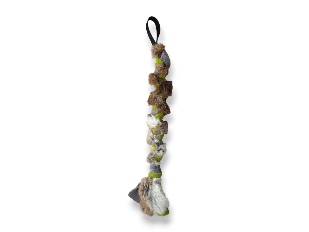 Atraktivní přetahovadlo z pravé králičí kožešiny a fleecu s ručkou z pevného popruhu.